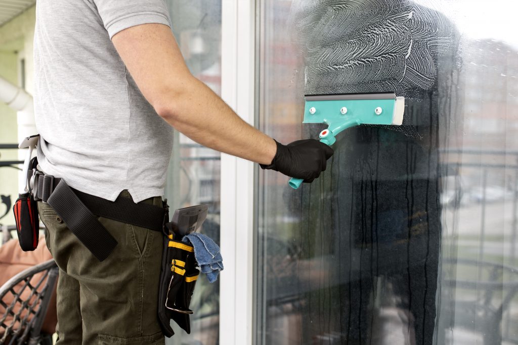 Reinigt Glas innen und außen – eine effiziente Grundreinigung für strahlende Fenster.